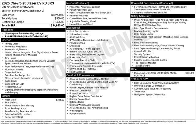 Elevate your driving experience with the 2025 Chevrolet Blazer EV RS. This exceptional electric SUV combines cutting-edge technology, premium features, and exceptional performance to deliver a truly remarkable driving experience. Visit Feldman Chevrolet of Livonia today to schedule a test drive and discover the future of electric mobility. Most vehicles have addendums with additional options added, call Dealer for details and pricing of the addendum. Must qualify for GM Employee pricing and the following incentives: $1250 - GM Conquest Private Offer. Exp. 04/30/2026 $1500 - Active UAW-GM Hourly Employee Vehicle Allowance. Exp. 01/04/2027 $3500 - Chevrolet Consumer Cash Program. Exp. 04/30/2026 $500 - GM Rewards Card Sales Sign Up and Spend Offer. Exp. 06/30/2026