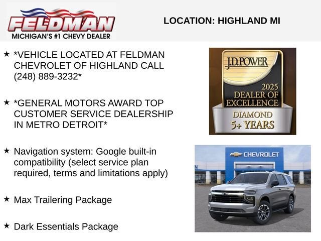 *VEHICLE LOCATED AT FELDMAN CHEVROLET OF HIGHLAND CALL (248) 889-3232*, *GENERAL MOTORS AWARD TOP CUSTOMER SERVICE DEALERSHIP IN METRO DETROIT*, 4WD, Jet Black Cloth, 1st and 2nd Rows All-Weather Floor Liners, 2-Speed Active Electronic AutoTrac Transfer Case, 3rd Row All-Weather Floor Liners, 6-Speaker Audio System Feature, 6-Way Power Front Passenger Seat Adjuster, 8-Way Power Driver Seat Adjuster, Advanced Trailering Package, All-Weather Cargo Mat, All-Weather Liner Protection Package, Apple CarPlay/Android Auto, Auto High-beam Headlights, Black Name Plates, Blind Zone Steering Assist with Trailering, Dark Essentials Package, Exterior Parking Camera Rear, Extra Capacity Cooling System, Front and Rear Black Bowtie Emblems, Hill Descent Control, Hitch View with Pan/Zoom Image Adjustment, Integrated Trailer Brake Controller, Max Trailering Package, Navigation system: Google built-in compatibility (select service plan required, terms and limitations apply), Premium audio system: Chevrolet Infotainment 3, Radio data system, Radio: 17.7 Diagonal Advanced Color LCD Display, Rain sensing wipers, Remote keyless entry, Remote Start, Smart Trailer Integration Indicator, Wheels: 20 x 9 Machined Aluminum.